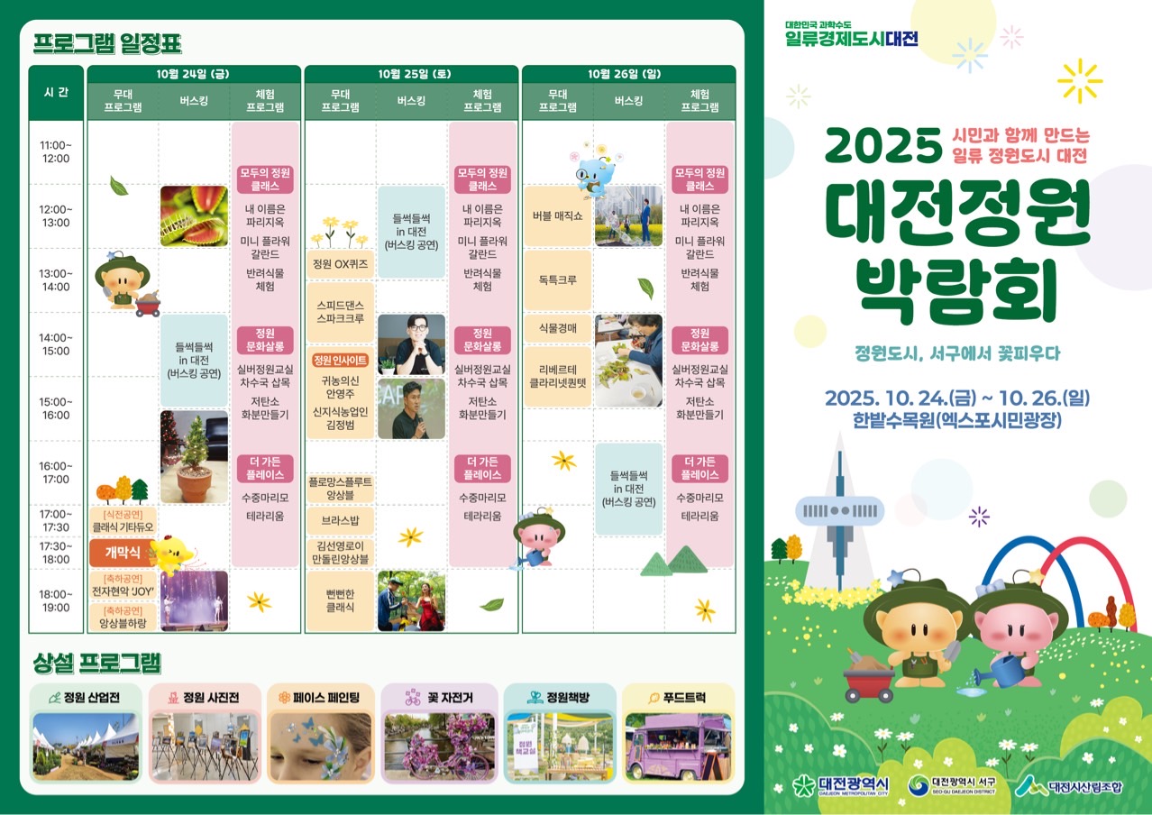 정원문화 확산과 정원산업 육성을 위해 대전시, 서구, 대전산림조합이 공동 주최·주관하는 ‘2025 대전정원박람회’가 오는 10월 24일부터 26일까지 3일간 한밭수목원(엑스포시민광장)에서 처음으로 개최된다.