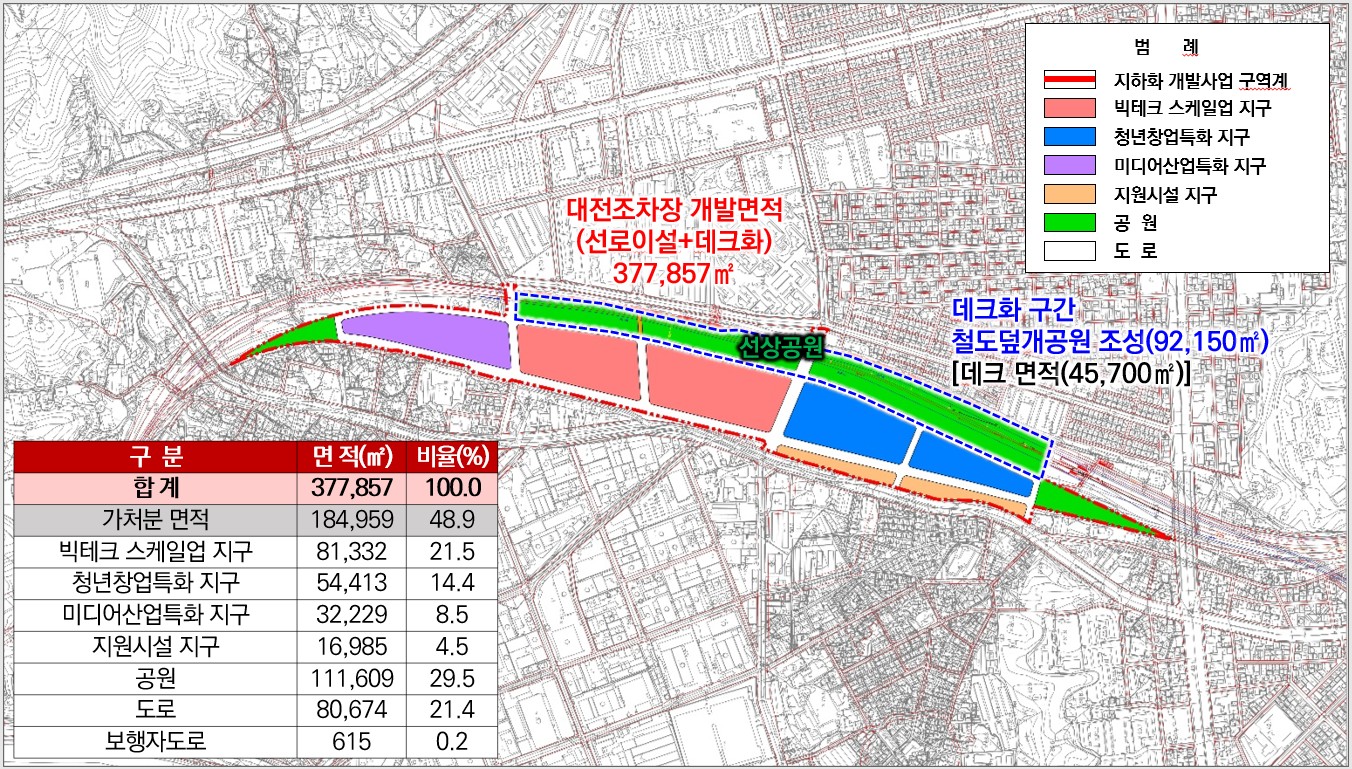 대전시는 조차장 기능을 이전하고 철도시설을 지하화해 도시 공간 단절을 해소하고, 확보되는 상부 공간을 대덕연구개발특구, 대전산업단지, 한남대학교 캠퍼스혁신파크와 연계한 빅테크․딥테크 기업 성장 공간과 청년 창업 공간, 신기술 창업․성장 플랫폼으로 구축하여 대전을 대표하는 미래 산업 거점으로 육성한다는 구상이다.