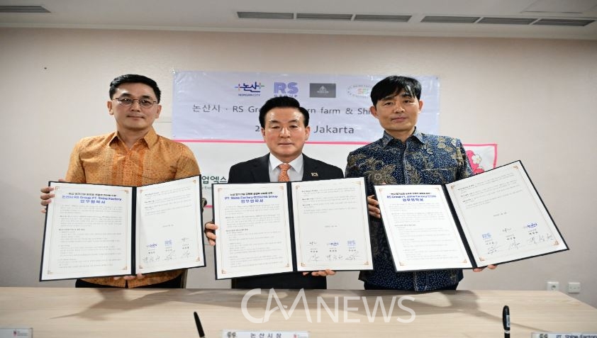 9일 논산시는 인도네시아 자카르타에서 알에스그룹(RS Group/대표 이승준), 샤인팩토리(PT. Shine Factory/대표 여종률)와 딸기산업의 경쟁력 강화를 위한 업무협약(MOU)을 체결했다.