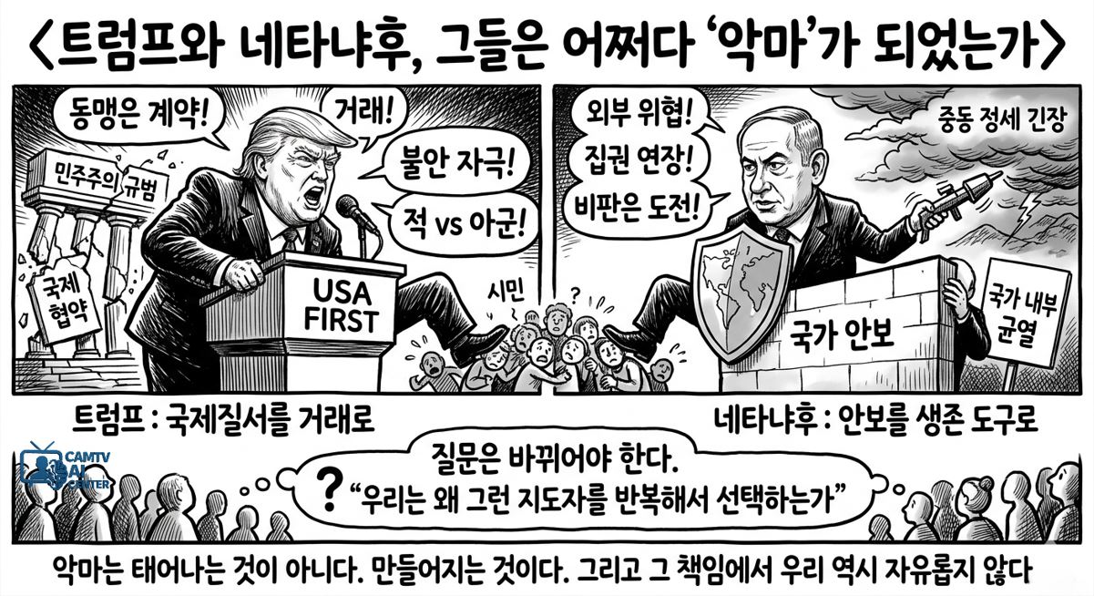 트럼프와 네타냐후는 시대가 만들어낸 산물이다. 분열된 사회, 불안한 경제, 그리고 정치적 양극화가 그들을 키웠다. 그렇다면 질문은 바뀌어야 한다. “그들은 왜 그렇게 되었는가”가 아니라, “우리는 왜 그런 지도자를 반복해서 선택하는가”이다.